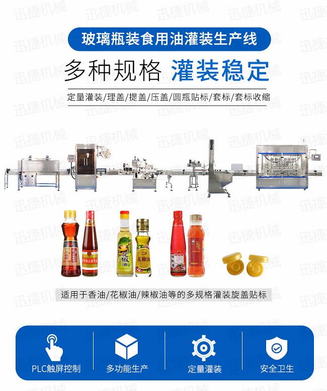 該系列灌裝機采用容積式計量灌裝原理,適用于各種規(guī)(100ml-1000ml)的南瓜籽油、榛子油、牡丹籽油、芝麻油、核桃油、山茶油、亞麻籽油、棉籽油、橄欖油、大豆油、玉米油、菜籽油等食用油灌裝。設(shè)備采用伺服驅(qū)動活塞計量,保證了 1‰的灌裝精度,在保證灌裝精度的同時,提高了 20%-35%灌裝速度,操作簡單,維護方便,節(jié)省人工成本,生產(chǎn)效率更高。