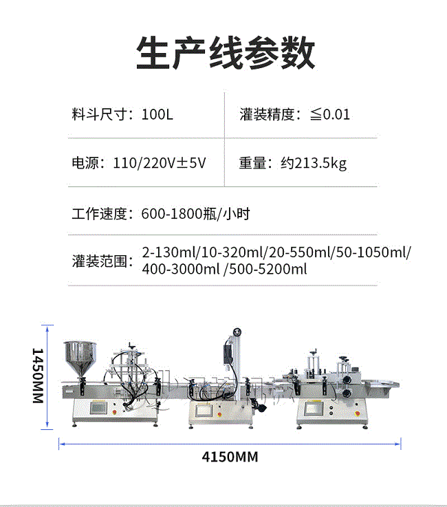 產品說明:生產線根據灌裝范圍選擇型號,灌裝部分為雙頭下潛式灌裝機,適用于不同物料不同瓶子的灌裝,配備自動壓蓋機和圓瓶貼標機,可實現不同蓋子的旋蓋貼標工作。 本設備主要適用于食品、日常化工、農藥、醫藥和特殊行業。灌裝精度將受氣壓的穩定性、物料的均勻性、灌裝速度等的影響。