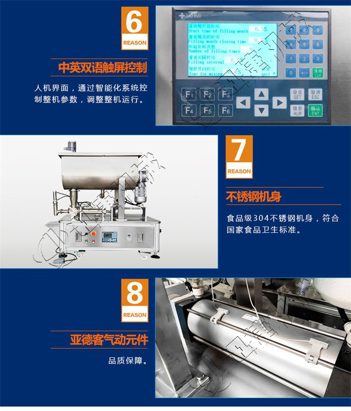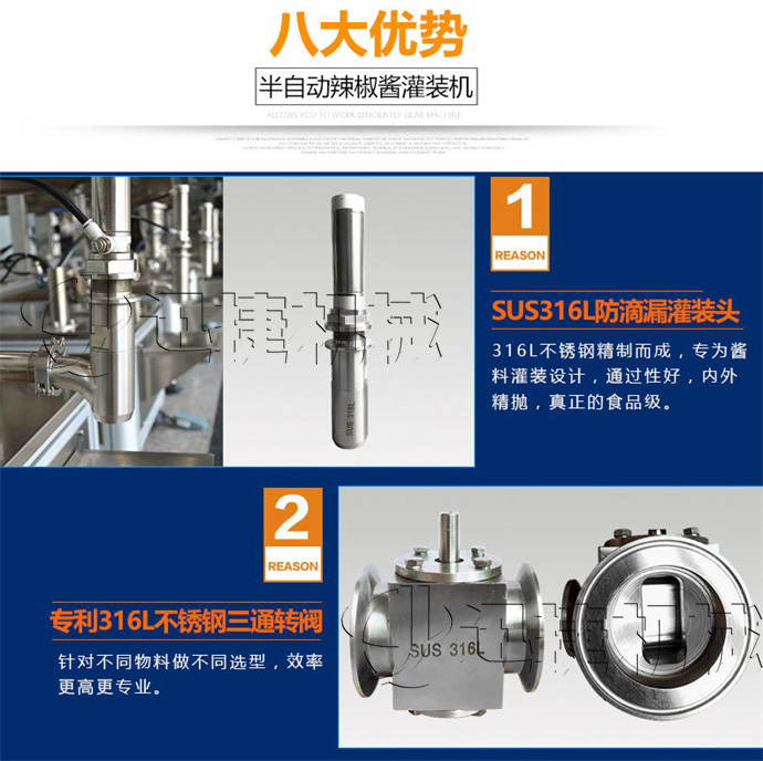 該半自動辣椒醬灌裝機適合于將各類粘稠體及含有各種固體物質如辣椒、花生、肉塊、佐料等物體的醬類和油、料分離的火鍋底料等灌裝于各種容器中,適用于辣椒醬、顆粒醬料、大塊肉醬、火鍋底料等醬體的灌裝。